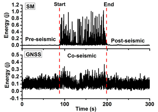 Figure 1 shows a comparison of average energies for GNSS and SM. The GNSS energy function has high levels of noise and, thus, cannot be used to accurately determine the signal start and end times. Consequently, it is unsuitable for real-time initialization of the GNSS velocity shifts, making implementation for earthquake monitoring and early warning in real-time difficult. However, the shaking window can be readily determined from the SM energy function, and it complements the GNSS system for the initialization shift before the earthquake and quality evaluation after the earthquake.
