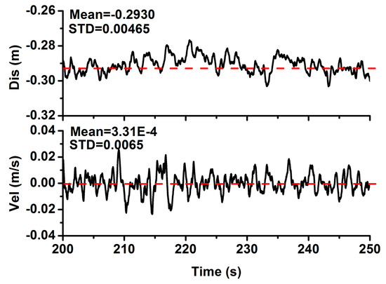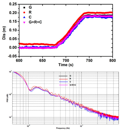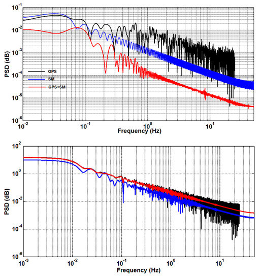 Figure 8 shows the power spectral densities (PSD) of the displacements obtained using different sensors; the top represents no motion, and the bottom represents the displacement motion. The GPS and SM combined system complements the advantages of each other, resulting in much smaller noise and much higher frequency than the GPS, and the removal of the baseline shift error in the SM.