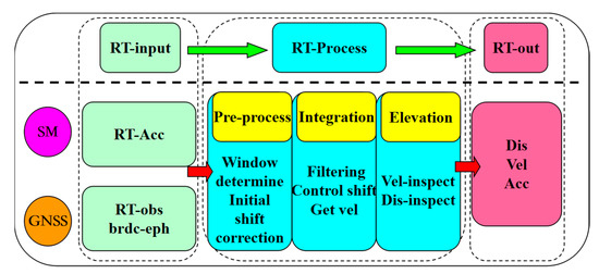 Real-time integration system of GNSS and SM observations. ‘RT’ indicates real-time, ‘Dis, Vel, and Acc’ represent displacement, velocity and acceleration, respectively, ‘obs’ represents observation, and ‘eph’ represents ephemeris.