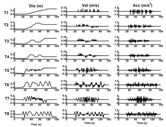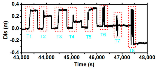 Figure 6 shows the displacement sequence that was used for the test. We simulated eight events (T1 to T8) by moving the platform from one side to the other. The reference displacements were recorded by a set of Vernier calipers fixed on the table. For each experiment, we initially kept the rig static at the start point for about 5 min; then, we slid the combined instruments from the start point to the end point, for over about 1 min; next, the rig was kept static at the end point for about 5 min; finally, the rig was returned to the start point for the next experiment. For the eighth experiment, it was not returned to the start point, as this was the end of the experiment. Owing to the design of the platform, movement was performed only in one direction along the rail.