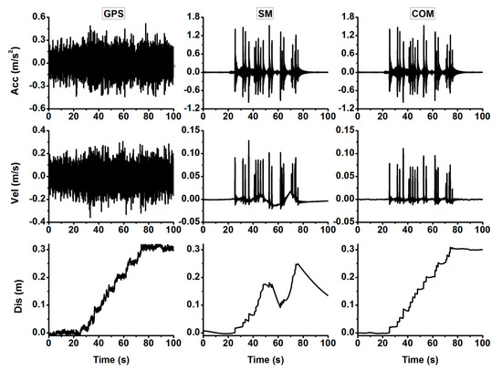 Comparisons of displacement, velocity, and acceleration for the GPS (left); SM (middle); and combined system (COM) (right).