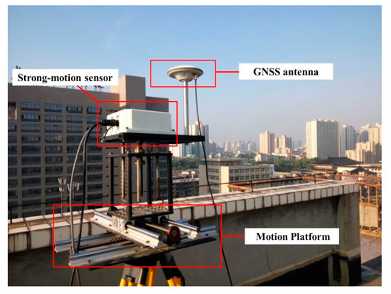 The integrated system was tested and validated using three different datasets: (1) an experimental dataset including GPS and SM observations collected simultaneously on a dedicated experimental platform; (2) an experimental dataset with the BeiDou Satellite System (BDS) and SM observations collected simultaneously in a dedicated experimental setup; and (3) GPS and SM data collected from the E1 Mayor-Cucapah earthquake. All three datasets were processed in a simulated real-time mode by only using data up to the processed epoch and L1 single-frequency GNSS observations; velocity and acceleration were analysed by the combined system. In addition, all the scenarios which are examined in the experiments are not the transient component, but the co-seismic component of the ground response.