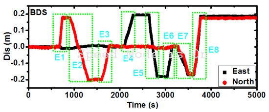 Figure 11 shows the movement sequence applied to the BDS and SM integration experiment. We simulated eight earthquake events (E1–E8) by moving the platform from one side to the other. As for the previous experiment, reference displacements were recorded by a set of Vernier calipers fixed on the table. For each experiment, we kept the rig static at the start point for several minutes at first; then, we slid the combined instruments from the start point to the endpoint over about 1 or 2 min; and finally, the rig was kept static at the endpoint for several minutes, before starting the next experiment. We carried out eight experiments in the horizontal component: three in a north–south direction, three in an east–west direction, and two in a northeast–southwest direction.