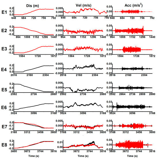 Displacement (left); velocity (middle); and acceleration (right) output of the integration system for the BDS and SM data. Black curves indicate east–west displacement of the test bed, whereas the red curves indicate north–south motion.