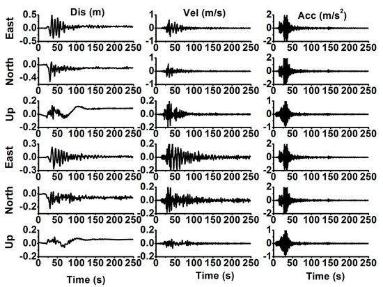Figure 14 shows the acceleration, velocity, and displacement information of the combined system in the east, north, and vertical components. The velocity sequence clearly reflects the waveform information, and the velocity fluctuates about the zero line after the earthquake. In the displacement sequence, the displacement fluctuates on the permanent displacement line.
