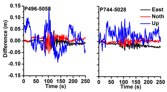 Differences of displacement waveforms between GPS and combined solutions. The (left) represents pairs of ‘P496-5058’; the (right) represents pairs of ‘P744-5028’.