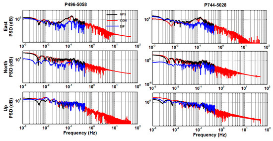 PSD of displacement waveforms by different methods (‘‘COM” represents the GPS and SM combined results, ‘‘DIF” represents the difference between GPS and combined results). The (left) represents pairs of ‘P496-5058’; the (right) represents pairs of ‘P744-5028’.