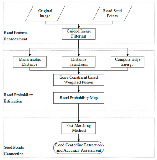 As shown in Figure 1, the proposed approach consists of three main steps. These steps include: (1) Road feature enhancement: The VHR image can reveal ground objects in great detail and depict the color, shape, size, and structure of objects. However, its spectra may contain considerable noise, which may reduce the reliability of the road extraction result. Thus, the image is first filtered through guided filtering to enhance road features; (2) Road probability estimation: Three road features are extracted, and an edge-constraint-based weighted fusion model is introduced for multifeature fusion and road probability estimation; (3) Seed-point connection: The fast marching method is used to link road seed points on the basis of the potential road map. To test the accuracy and efficiency of the proposed approach, the performance of the proposed method on four VHR images is compared with that of other road extraction approaches.