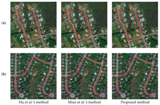 The results of the three methods are compared in Figure 4. This figure shows that all the three methods extracted the expected road centerlines. Compared with that of Hu’s method, the performance of Miao’s method and the proposed ECFM method improved with the number of road seed points. The proposed ECFM method, however, provided better results for both images than Hu’s and Miao’s methods. Table 1 shows the quantitative evaluation results of the three methods. Among the three tested methods, the presented method achieved the highest quality values for the two cases. These values coincided with the extraction results presented in Figure 4. Although Hu’s method accurately extracted centerlines, it consumed more road seed points than the other two methods because it requires intermediate road seed points when extracting centerlines from S- or U-shaped road segments. By contrast, the proposed method extracts centerlines from S- or U-shaped roads with only two road seed points.