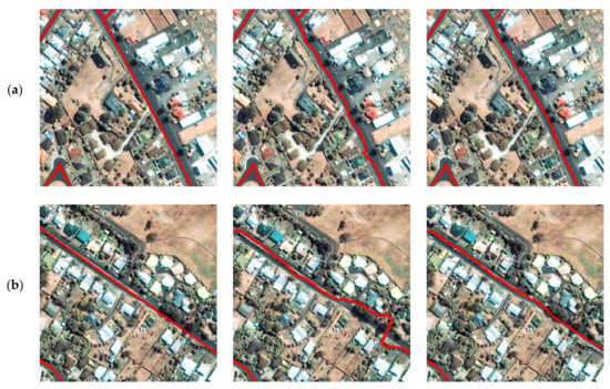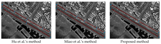 Figure 10 shows the results of three different methods for extracting the road centerline from an IKONOS grayscale remote sensing image. As can be seen from the figure, all roads can be extracted completely by the three methods. The road centerline extracted by Hu’s method is the smoothest, but the limitation of the piecewise parabolic model it uses causes the extracted results in areas with large changes in road curvature to tend to deviate from the road center. Miao’s method and the ECFM method can avoid this problem. Compared with Miao’s technique (which considers only the spectral features of roads), the ECFM method (which fuses the edge features and spectral features, thereby potentially overcoming the influence of spectral changes placed by shadows on road extraction results to a certain extent) shows better performance on shadow and vegetation occlusion. As can be seen from the statistical results in Table 3, the extraction completeness of all three methods is high when the same number and location of road seed points are used. However, our method achieves the best performance in terms of extracting correctness indicators. Similarly, our method demonstrates the best quality.