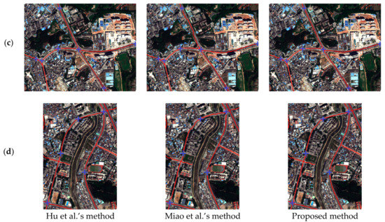 Comparison of the results provided by different road extraction methods for an IKONOS image. (a) Case 1; (b) Case 2; (c) Case 3; (d) Case 4.