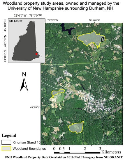- University of New Hampshire, Office of Woodlands and Natural Areas, General Information. Available online: https://colsa.unh.edu/woodlands/general-information (accessed on 24 July 2017).