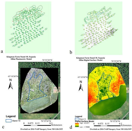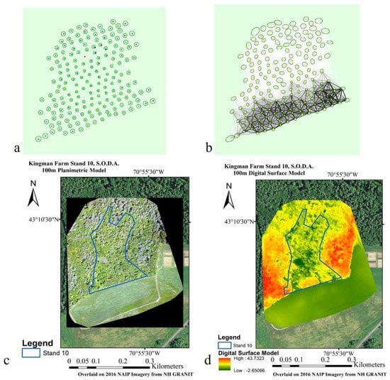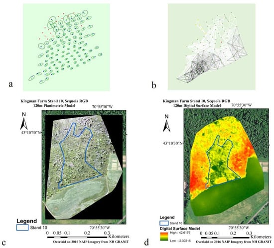 Finally, the Sequoia RGB sensor flying at 120 m above the forest canopy captured 117 images, of which 102 (87%) were aligned. The image alignment and key point matching diagrams (Figure 8a,b) showed lower comprehension throughout the northern half of the study area, corresponding with the interior forest. Pix4D processing resulted in a 1.73% camera optimization difference with an average of 25,505 tie points and 1033.83 tie point matches per image. The overall processing time was 50:13 min, which generated a 14.926 ha (0.1493 km2) planimetric model at a 4.44 cm-gsd and 0.273 pixel re-projection error (Figure 8c). Weak image alignment and tie-point matching in the upper half of the forest stand formed regions of inconsistent clarity along the edges of the study area (Figure 8c,d).