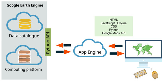The infrastructure for spatial application development provided by Google. GEE consists of a cloud-based data catalogue and computing platform. The App Engine framework was used to serve the data to a web browser and communicate with the GEE using the Python API. Figure reused with permission from Poortiga et al. [63].