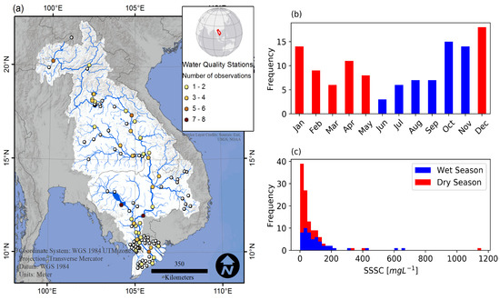 From the original 132 MRC water quality stations, a total of 44 stations met our quality control criteria for having collections >60 m from the bank. (Figure 4). For the 44 selected MRC stations there were relatively few cloud-free, coinciding Landsat observations within one day of in situ sampling. Out of a total 24,749 in situ samples from the MRC dataset, a total of 118 Landsat observations met the criteria for inclusion in the empirical model across the 44 stations (see Appendix A for detailed information on the stations used). Figure 4 displays the spatial, temporal, and SSSC concentration distributions from the acquired coincidence samples. Overall, in situ samples and coincident Landsat observations were recovered from a variety of locations throughout the basin, but coincident observations were most common along the Mekong mainstem and larger tributary systems (Figure 4a). In total, the calibration dataset includes 8 stations located in the the Mekong River main stem, 11 stations located in tributary systems, 22 stations from the Mekong Floodplain (which constitutes all stations downstream from Kratie [35]), and 3 stations located within reservoirs (Table A1). The calibration and validation dataset includes 118 Landsat observations coincident with in situ SSSC measurements, 66 of these instances come from the dry season (December to May) , while 52 occurred during the wet season (June to November), providing a good representation of both the wet and dry seasons for statistical analysis (Figure 4b). The range of in situ SSSC values in the calibration dataset is 1.0–1155.0 mg·L for the dry season and 8.0–655.0 mg·L for the wet season (Figure 4c).