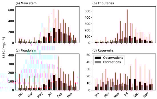 Monthly median estimates of SSSC from 1985–2011 against observed monthly median SCC for the 44 water quality stations used in this study. The stations were classified into four groups: (a) mainstem of Mekong river; (b) tributary river systems; (c) the Mekong floodplain region and (d) reservoirs. Red bars indicate the standard deviation of each month from all stations in the group.