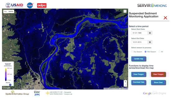 Landsat derived SSSC values are available through a simplified web-interface (Figure 7, https://mekong-ssc.appspot.com) that utilizes GEE and AppSpot technologies. Users define a time period of interest, season to process (wet season, dry season, or all months), and a region of interest. Then the application calculates the mean SSSC value for each Landsat pixel in the region of interest from all of the cloud free Landsat observations of that pixel within the selected time period. Users also have the option to generate time series charts through the web application. Calculated SSSC time series values are displayed in the web application and the calculated values are available for download. Users can download the chart as an image or the raw time series data as a CSV file. The time series option displays the mean SSSC concentration calculated for all pixels in the defined region for each time step available.