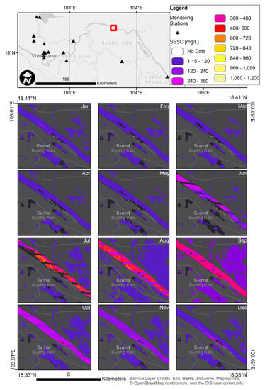 Estimated monthly average SSSC from 1985–2011 near Bueng Kan city located 185 km downstream of the nearest MRC station. Top map displays northeast Thailand bordering Laos with surrounding MRC water quality monitoring stations and an indication of the monthly SSSC maps. The SSSC scale in the legend refers to the monthly maps below.