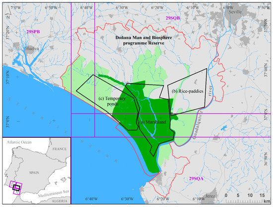 Map of the study area located in southwest Spain. All assessments were carried out for the Biosphere Reserve area as shown in this figure, additionally including a buffer zone of 1 km outside the boundary line. Red line: Biosphere Reserve, which is formed by the natural park in light green and the national park in dark green; purple line: Sentinel-2 tiles. The boundaries of different types of wetlands, (a) marshland, (b) rice-paddies and (c) temporary ponds, in the Biosphere Reserve are indicated with black lines.