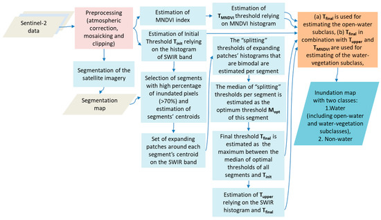 User independency is provided throughout several local automatic thresholding approaches [26,27], which separate the image into non-overlapping image subsets of user-defined size and estimate local thresholds splitting flooded from non-flooded areas. However, the use of image subsets with a fixed size can be problematic when applying an algorithm to different regions and satellite images with different spatial resolutions. In the present work, the optimal threshold per segment is estimated relying on multiple “splitting” thresholds calculated from patches of expanding size, which are centered on each segment’s centroid. This increases the robustness to image resolution changes compared to the use of just one patch of predefined size. Additionally, this approach suggests the use of the MCET algorithm [30] for gray level thresholding, while most common thresholding algorithms in the field are Otsu’s [21] and Kittler and Illingworth’s [25] algorithms and their variations.