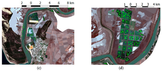 (a) Initial inundation map generated after applying to the SWIR band (the centroids of the segments having a large percentage of inundated pixels are visualized as green dots) with three subsets denoted on the map; (b) additional inundated pixels found after applying to the SWIR band, compared to the initial inundation map, for Subsets 2 and 3; (c) the mean-shift segmentation map of Subset 1 with the included centroids; and (d) the mean-shift segmentation map of Subset 2 with the included centroids.