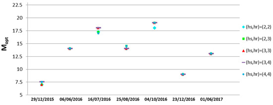 The mean-shift segmentation map is exploited for segmenting the satellite image into non-overlapping regions (see Section 2.4.1). Therefore, it is important to verify that variations to the selected parameters (hs,hr) = (3,3) do not significantly affect the estimation of . The additional sets of tested mean-shift parameters are (hs,hr) = (2,3), (hs,hr) = (3,3), (hs,hr) = (3,4) and (hs,hr) = (4,4). The points in Figure 6 show for the 7 dates that S2 and Landsat overpasses coincide (see Table 1) and for 5 different selections of (hs,hr), the estimated . It is deduced that the influence of the variation of the segmentation parameters on the estimation is negligible, since most values per date coincide or are very close.