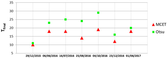 A prevalent method for estimating an optimum threshold separating two classes is the Otsu method [21]. This method has been used in multiple approaches in the literature aiming at separating pixels into inundated and non-inundated classes [10,22,23,24,42]. In this experiment, MCET is replaced by the Otsu method, while the rest of the steps of the unsupervised approach are kept the same. The points in Figure 7 show the estimated for 7 dates by the two methods. The derived is always greater when using the Otsu method. The inundation maps generated relying on the use of MCET or the Otsu method are validated in Section 3.2, and the results suggest the use and better fit of the MCET method in the presented unsupervised methodology.