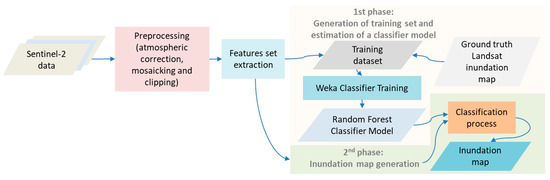 The training dataset of each date is then loaded into the WEKA open source machine learning software [46] in order to train a Random Forest (RF) classifier, which is an ensemble of trees [47], per date. A 10-fold cross-validation is performed, i.e., the training dataset is randomly partitioned into 10 subsets of equal size, where a single subset is retained as the validation data for testing the model, and the remaining 9 subsets are used as training data. The cross-validation process is repeated 10 times, with each of the 10 subsets used exactly once as the validation data, and the 10 results are averaged to produce a single estimation. At the same time, the RF parameters were set to default (e.g., 100 trees). In this way, an RF model is generated per date. This is then applied (2nd phase in Figure 10) to the features calculated for the pixels of the S2 image acquired at the same date, in order to classify the image into water and non-water areas. On average, the time required to train the model, estimate the features and perform the classification per date is about 4 h and 20 min on a PC with an i7 CPU at 3.4 GHz and 128 GB of RAM. In comparison, the time required for the execution of the unsupervised methodology for these dates ranged from 22–37 min.