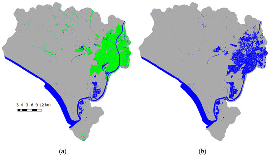 (a) Unsupervised inundation map on 20 August 2017 containing two classes of pixels: (i) water class pixels (including open-water pixels denoted with blue and water-vegetation pixels denoted with green) and (ii) non-water class pixels with gray; and (b) supervised inundation map on 20 August 2017 containing two classes of pixels: (i) water class pixels denoted with blue and (ii) non-inundated pixels with gray.