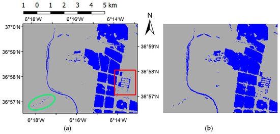 Pixels of the water-vegetation subclass are demonstrated in the map of Figure 9a. Evidently, the water-vegetation subclass is mainly detected in the upper right area of the map, where the rice-paddies are located. These results comply with the growing cycle of rice, since the rice grows during the summer period in Doñana and at the same time the paddies are flooded [43]. MNDVI is preferred to the NDVI index (its formula is given in Table 3), since the use of NDVI causes the appearance of false positives in areas where water vegetation pixels are not expected, such as the areas enclosed in the red oval in Figure 9b (mainly vegetation inside sand dunes). The latter reveals that the higher spatial resolution of S2 Bands 4 and 8, used for calculating NDVI, is not that reliable as the narrow spectral width of S2 Bands 5 and 7, used for calculating MNDVI.