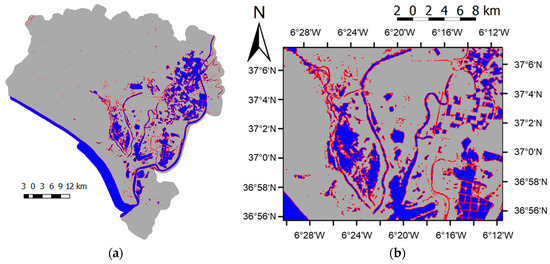 In order to compensate for the uncertainty caused in the validation due to the lower spatial resolution of the Landsat-derived inundation maps, two validation results are presented: in Situation (i), boundary regions between inundated and non-inundated pixels are excluded from the accuracy estimation, and in Situation (ii), boundary regions are included. Pixels in the area corresponding to sea coastal waters are not taken into consideration to obtain unbiased classification results. Landsat inundation maps are comprised of the water class and the non-water class. The boundary regions in the Landsat mask are comprised of pixels including in their eight closest-neighbor pixels at least one pixel of a different class. Figure 13a shows a map including the boundary regions and Figure 13b a zoomed region of it.
