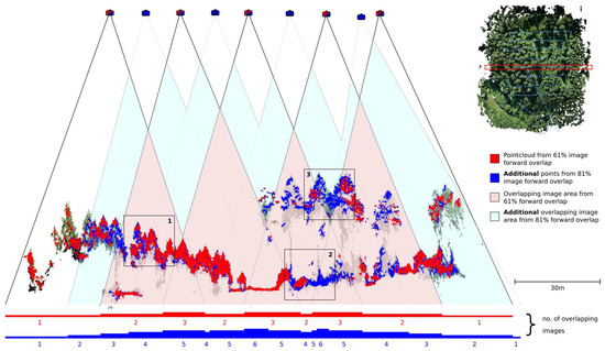 Illustration of reconstruction results classified by different image overlap scenarios at a 5m transect. Point colors refer to the camera icon colors used for the reconstruction. Colored background point cloud indicates best achieved result with 95% overlap. Bar charts indicate the number of overlapping images on the ground at the specific position at 61% (red) and 81% (blue) overlap. Numbered boxes highlight varying reconstruction quality across different scenes, with (1) showing low vegetation; (2) showing understory vegetation; and (3) showing upper canopy reconstruction.