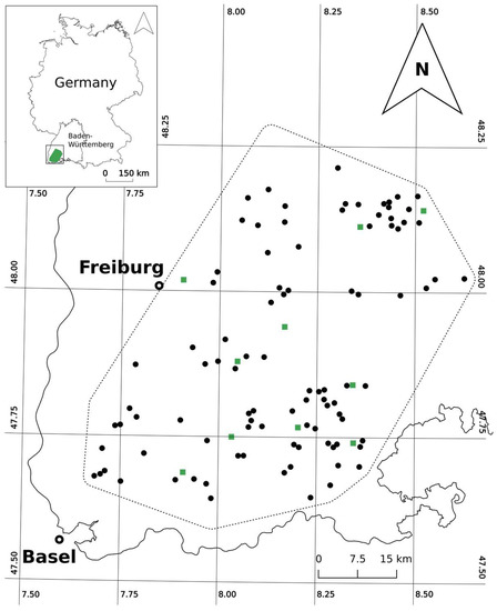 The study was part of the (Conservation of Forest Biodiversity in Multiple-Use Landscapes of Central Europe) ConFoBi Project which has 135 research plots of one (1) hectare each in the Black Forest region of the state of Baden-Württemberg in south-west Germany. The area is a medium sized mountain range between roughly 250 m above sea level in the Rhine valley and 1493m a.s.l. at the highest peak. The area is primarily covered by forest (69%) and has a long history of forest use. The dominant tree species is the Norwegian Spruce (Picea abies L.) with an admixture of Silver Fir (Abies alba Mill.) and Scots Pine (Pinus sylvestris). We find the aforementioned softwood species in 82% of this area’s forest stands, while broadleaf tree species account for less than 30% [2]. The area is mostly managed using selective harvesting, since clear cuts are strictly regulated in Germany.
