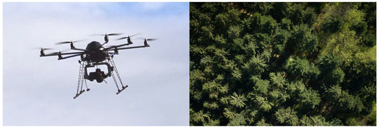 The aircraft used in this field campaign is an OktoXL 6S12 from Mikrokopter (Mikrokopter GmbH, Moormerland, Germany). A Sony Alpha 7R (Sony Europe Limited, Weybridge, Surrey, UK) full-frame camera with a 35 mm focal length prime lens was used as an RGB camera mounted on an active multi-axis gimbal. The camera was set to F-stop: 2.8, Shutter: 1/2000 s, and ISO-values that were manually adapted to the given lighting situations between 250 and 1000 ISO. The focus was set manually to roughly 70 m. The camera was aligned vertically (nadir) with the aid of a bubble level, and the top side of the camera was set toward the direction of flight. Figure 3 shows an image of the drone platform with mounted gimbal and camera, as well as an aerial image of the canopy taken during flight. The copter was launched manually using a twin stick transmitter and maneuvered through the canopy, after which it was set to autonomous flight according to a predefined flight plan. Following completion of the autonomous mission, manual control was again employed and the aircraft was landed. During the flight, the aircraft automatically triggered the camera every 3 m via a trigger cable, simultaneously recording the GPS position using an internal GNSS sensor (GPS and GLONASS).