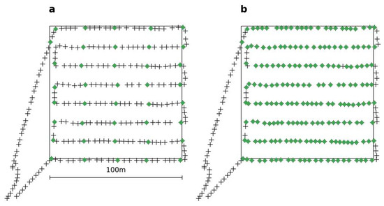Example of location of image acquisition during a flight (black crosses) over a research plot of 100 × 100 m. Green circles indicate pictures selected for virtual flight plans for (a) 5 images, and (b) 25 images on every 100 m stripe.