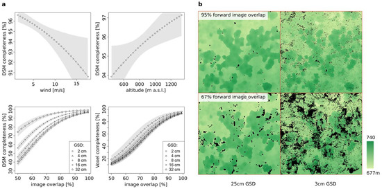 (a) Effect plots of statistical model parameters on SfM-model completeness. Plots in the upper quadrant refer to the model on the full dataset, while the lower quadrant refers to the experimental dataset. Grey areas illustrate the 95% confidence intervals. (b) Visualization of rendered DSMs of one experimental plot with 25cm GSD (left quadrant) and 3cm GSD (right quadrant). Forward overlap of 95% (upper quadrant) and 67% (lower quadrant). Lower altitudes appear yellow, higher in green. Black pixels indicate missing values.