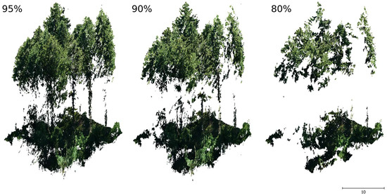3D pointcloud scenes of a 20 × 20 m plot employing different image forward overlap scenarios (percentages), showing the consistency of reconstructing points higher in the canopy, with diminishing reconstruction quality in the understory and under obfuscation.