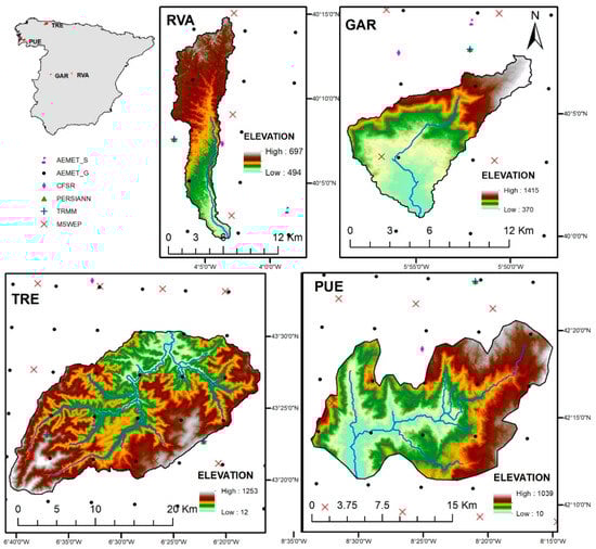 The gauged precipitation dataset consists of the nearest rain gauge records (AEMET_S) to each studied watershed (Figure 1), provided by the AEMET. The main characteristics of gauged stations are shown in Table 3.