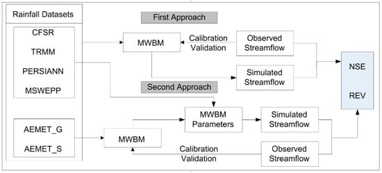 There are two different strategies to assess the performance of the GPDs in simulating streamflow [50]. The first approach is calibration and validation of MWBMs using rain gauge data or gridded rainfall datasets with monthly observed streamflow. The second approach is calibration and validation of MWBMs with rain gauge data followed by the best fitted parameters found in MWBMs being used to simulate streamflow with GPDs. Artan et al. [51] and Zeweldi et al. [52] indicated that an MWBM can be improved when using satellite-based data [51,52,53]. Nevertheless, Habib et al. [54] considered that calibration achieved with GPDs could result in unrealistic parameter values in MWBMs to compensate for the large errors in input datasets. In this study, both approaches will be carried out (Figure 2).
