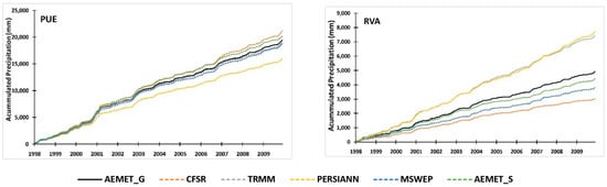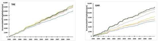 The first study performed consisted of analysing and comparing the areal mean rainfalls in the studied watersheds for the five different datasets considered. Figure 3 shows the accumulated precipitation from 1998 to 2009. As expected, both values of the national grid (AEMET_G) and the nearest rain gauge (AEMET_S) are quite similar, and their disparities in the last third of the period varies depending on the difference between rain gauge elevation, the watershed’s average altitude, and their proximity to the studied watershed. Thus, for example, TRE’s nearest record station is located in this watershed and within the average range of its altitude, so the accumulated precipitation only differs slightly. However, RVA’s rain gauge, which is located out of the boundaries of the watershed, is at a lower height than the whole study area and shows higher differences than the AEMET grid.
