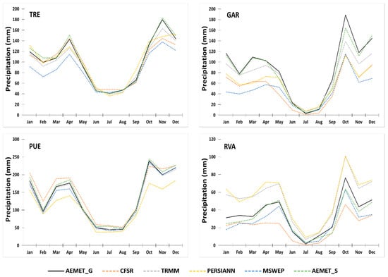 The long-term monthly areal rainfall for all the datasets considered and the four watersheds under study are shown in Figure 4. Although the monthly tendencies in all GPDs are similar to gauged data, the differences are mostly concentrated in the rainy seasons, while they are reduced in summer months. TRMM estimates are close to those from the rain gauge data and are lower than recorded precipitation, except in RVA, where MSWEP appears to be the dataset that fits the best with national grid or nearest rain gauges. Moreover, as in the accumulated precipitation analysis, GAR and RVA show the highest differences with GPDs, even wider in RVA, where TRMM and PERSIANN precipitation data are around 50% higher than the data from the AEMET dataset.