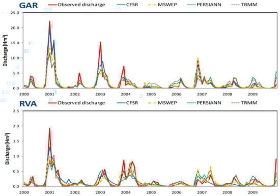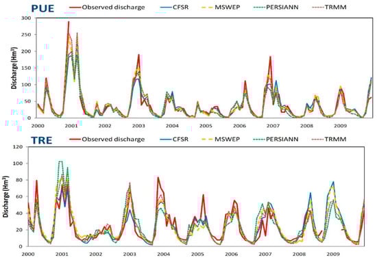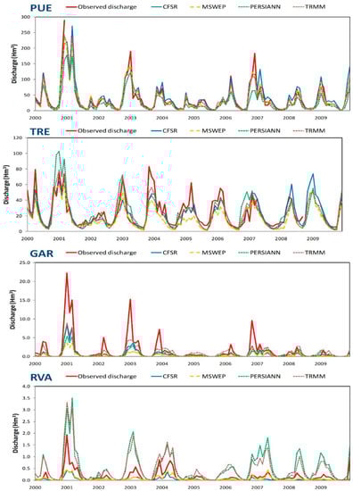 Figure 5 shows the comparison between the observed and simulated streamflow when using GR2M, which resulted, as seen, generally, in the best MWBM in the four watersheds. The peaks of simulated flow are poorly modelled due to the underestimation in precipitation driven by the GPDs. These differences tend to be higher the drier the watershed is, as shown before, and regardless of the area. In fact, PUE and TRE observed peaks in the rainiest years (2001, 2003, and 2007) are nearer to simulated ones with most GPDs (especially TRMM and MSWEP) than in GAR and RVA watersheds, where simulated peak flows in 2001, 2003, and 2004 are lower than observed ones [62,63,64]. Nevertheless, there are other peak flows (though lesser in number) where simulated peak flows exceed observed ones, such as PERSIANN in TRE in 2001 and MSWEP and PERSIANN in RVA in 2007 and 2008, highlighting the higher precipitation volumes in these GPDs. However, base flows are well-modelled in all watersheds, reflecting the good results in NSE with GR2M (Table 4), despite differences in peaks, which are reflected in REV (Table 6).