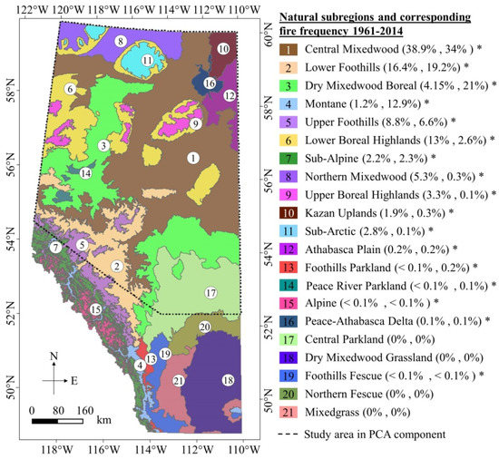 Map illustrating the location of the study area, and fire frequency (percentage of lightning- and human-caused in parenthesis, respectively) in all 21 natural subregions during the period of 1961–2014 in Alberta, Canada. The asterisk marks denote the subregions where we observed at least one fire occurrence during the period of interest.