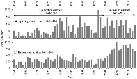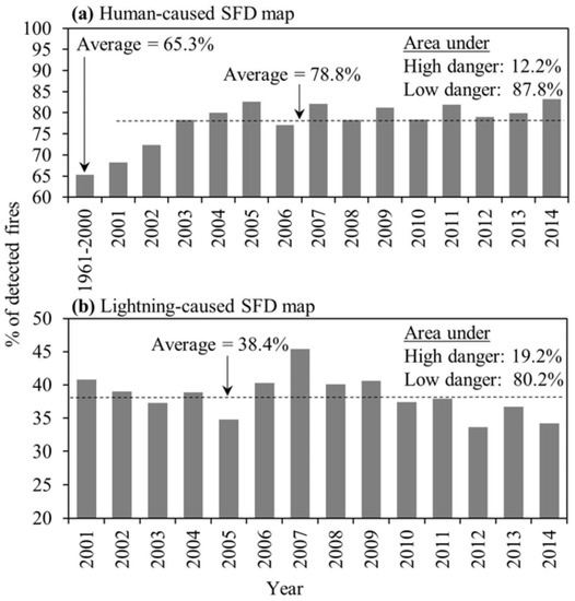 We compared both the human- (i.e., road buffer) and lightning-based SFD maps against the ground-based forest fire spots during the periods of 1961–2014 and 2001–2014, respectively (Figure 5). We found that 65.3% and 78.8% of the fires occurred within the high danger class of the human-caused SFD on an average during the periods 1961–2000 and 2001–2014, respectively, while 87.8% and 12.2% of the study area fell under the low and high danger classes, respectively. It is interesting to note that the historical human-caused fires during the period 1961–2014 showed an increasing trend since 2001 (Figure 2). In fact, our analysis revealed that an increment of 13.5% (i.e., from 65.3% to 78.8%) on average during the 2001–2014 period, in comparison to 1961–2000, occurred within the 500 m distance from the roads’ center. This might be related to the fact that human accessibility to the forested areas increased due to several factors. Those included: (i) the expansion of the oil and gas companies’ activities in the heart of forested lands; (ii) the establishment of more recreation facilities and camps near the roads; (iii) the relatively warmer weather; and (iv) cheaper vehicles to increase the number of visitors [20,23]. In addition, the observed results were similar to the literature that indicated road networks could be employed as a good indicator to detect human-caused fires [24,25].