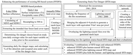 In general, most of the above-mentioned systems had either coarse spatial or temporal resolutions. In contrast, Chowdhury and Hassan’s proposed method had not only demonstrated its ability to forecast danger conditions at daily time-scales with 500 m spatial resolution, but also over Canadian boreal forested regions. Despite this, it had several issues, such as: (i) only one variable (i.e., PW) was available on a daily time-scale; (ii) it applied a gap-filling algorithm [13] to infill the cloud-contaminant pixels that was not only time consuming, but also unable to eliminate all the cloudy pixels; and (iii) it did not incorporate the source of ignition, including lightning- and human-caused fires, in the makeup of the system. In order to address these issues, our objectives were three-fold. Firstly, we exploited historical fire occurrences caused by both lightning and human activities in order to generate cause-specific static fire danger (SFD) maps. Secondly, we opted to enhance the legerity of the existing system (i.e., FFDFS) described in our earlier studies [1,8,13] by: (a) employing a daily-scale Ts; (b) removing the gap-filling algorithm upon the assumption that the cloud-contaminant pixels would exhibit low fire danger conditions; and (c) replacing the NMDI using NDWI, as this would be simpler to compute. Finally, we combined the remote sensing-based danger conditions (as outlined in the first step) with the two SFD maps, and evaluated their overall achievements.