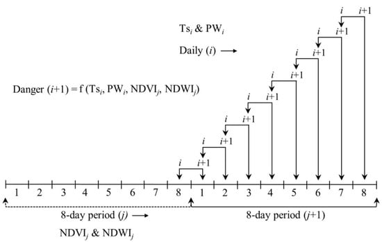 The schematic diagram of employed method, along with characteristics of danger condition in day (i + 1) using the model input variables including: actual daily surface temperature () and precipitable water (); and synthetic daily normalized difference vegetation index () and normalized difference water index ().