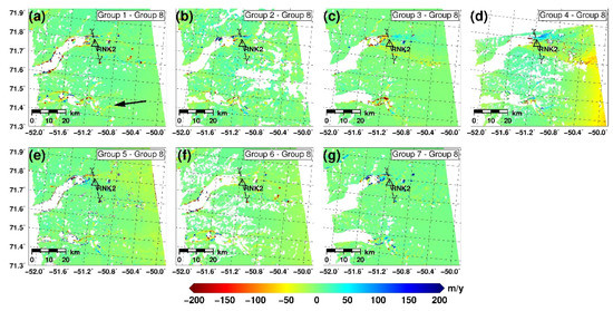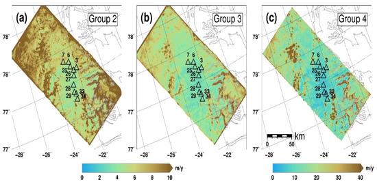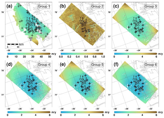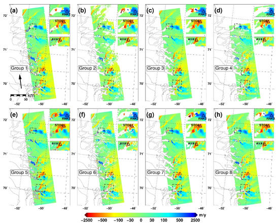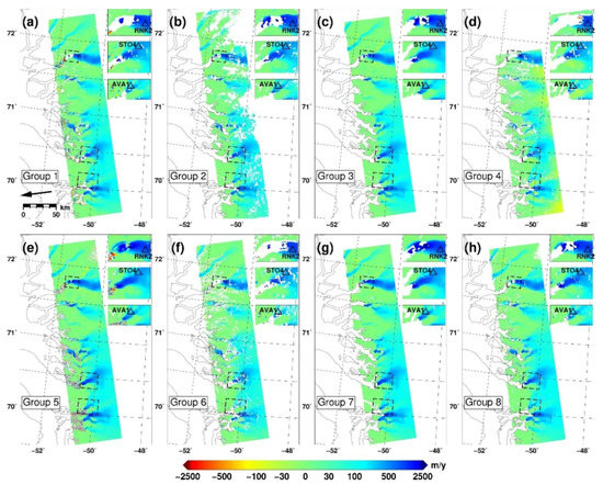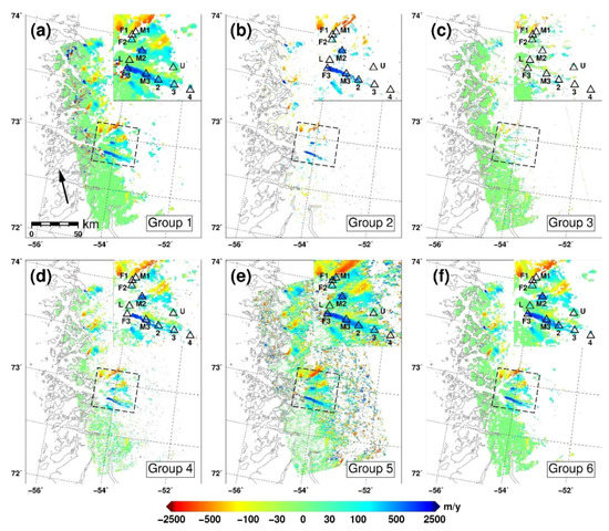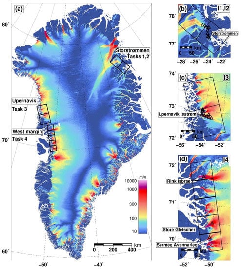 - Joughin, I.; Smith, B.E.; Howat, I. A complete map of Greenland ice velocity from satellite data collected over 20 years. J. Glaciol. 2017, 64, 1–11. [Google Scholar] [CrossRef]