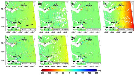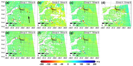 - Ahlstrøm, A.P.; Andersen, S.B.; Andersen, M.L.; Machguth, H.; Nick, F.M.; Joughin, I.; Reijmer, C.H.; van de Wal, R.S.W.; Boncori, J.P.M. Seasonal velocities of eight major marine-terminating outlet glaciers of the Greenland ice sheet from continuous in situ GPS instruments. Earth Syst. Sci. Data 2013, 5, 277–287. [Google Scholar] [CrossRef]