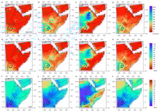 Another feature of the EA rainfall is the marked spatial variability of seasonality, as shown by [12], who divided the EA territory in subareas with respect to rainfall seasonality. West Ethiopia, the Ethiopian Rift Valley and South Sudan are characterized by only one wet season lasting from March–April to September–October, and reaching its maximum during July and August. Proceeding to the southeast, two distinct rainfall peaks are increasingly distinguishable up to the point that two distinct wet seasons (MAM and OND) can be told apart separated by two dry seasons. This seasonal cycle spatial distribution is observable also in Figure 4a–d, where PRCPTOT is shown at seasonal scale. The maximum rainfall accumulation occurs during JJAS in the western portion of the territory, in particular, over the Ethiopian Highlands, where PRCPTOT reaches values up to 1000 mm, thus accounting for more than 50% of the mean annual total precipitation in the area. Moreover, the high total amount of rainfall of this zone matches high R1 values (from 50 to more than 100 precipitating days, Figure 4g), longer wet periods (CWD ≥ 14 days, Figure S5k), and shorter dry periods (CDD values up to 10, Figure 4k), which are scarcely comparable with the values of the other seasons. From Figure 4, JJAS appears to be the major dry season for eastern Ethiopia, Somalia, Kenya, Tanzania, and northern South Sudan. MAM and OND contribute to about 50% of the mean annual PRCPTOT in eastern EA. These two seasons show very similar spatial patterns in terms of the rainfall indices. The highest PRCPTOT values are concentrated over DRC, Uganda, Lake Victoria, central Ethiopia (particularly during MAM), and Kenya, but the peak values are generally lower than those of JJAS. The same is true for the number of precipitating days (R1, Figure 4e–h), which does not exceed 60–70 days, and the duration of the wet periods, generally, is no longer than 16 days. Only Tanzania and the surroundings of Lake Victoria have moderate/weak rainfall in JF, a dry season for almost all EA.