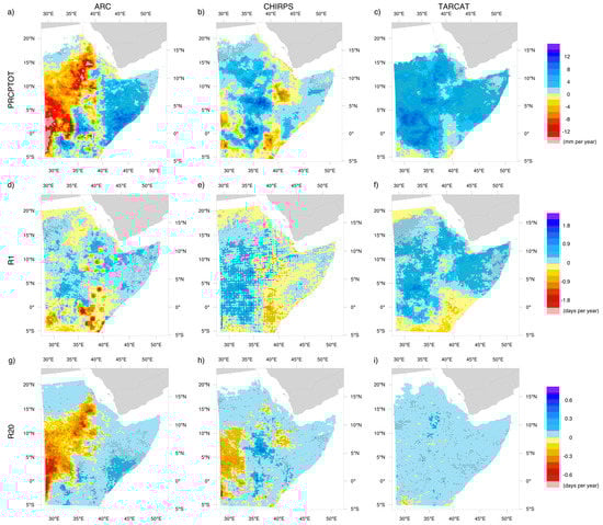 A general characteristic of the trend analysis of JJAS precipitation indices is the larger extent of the areas with statistically significant trends with respect to the previous seasons, in particular, for PRCPTOT, R1, CDD, and SDII. The PRCPTOT spatial trend patterns split the territory in two areas with opposite trend tendencies along a NE–SW direction, the wider areas of significance being on the western part (Figure 13a–c). CHIRPS and TARCAT evidence increasing trends in this part of EA, reaching the maximum rain rate values up to 5 and 6.8 mm per season, respectively.